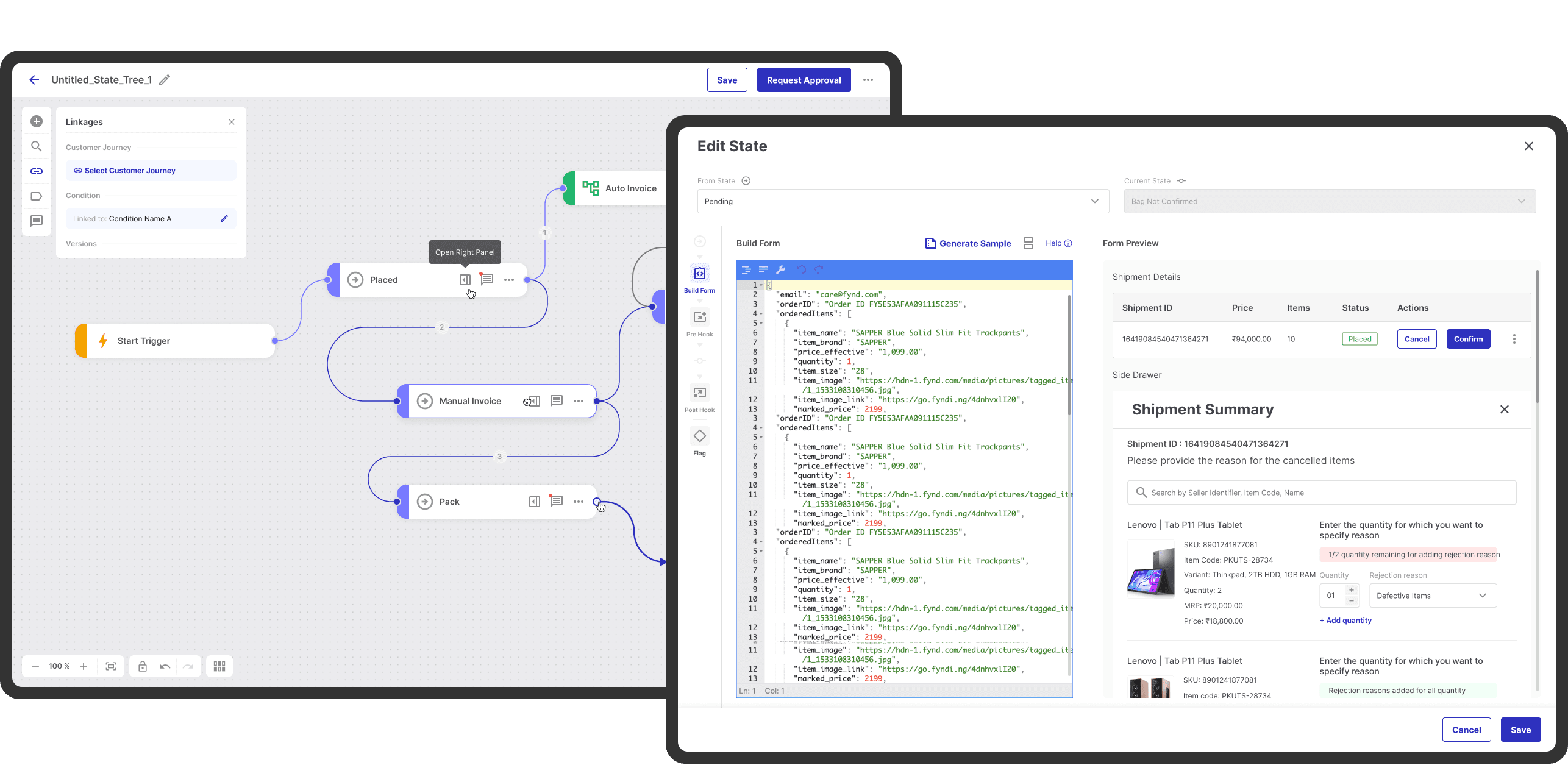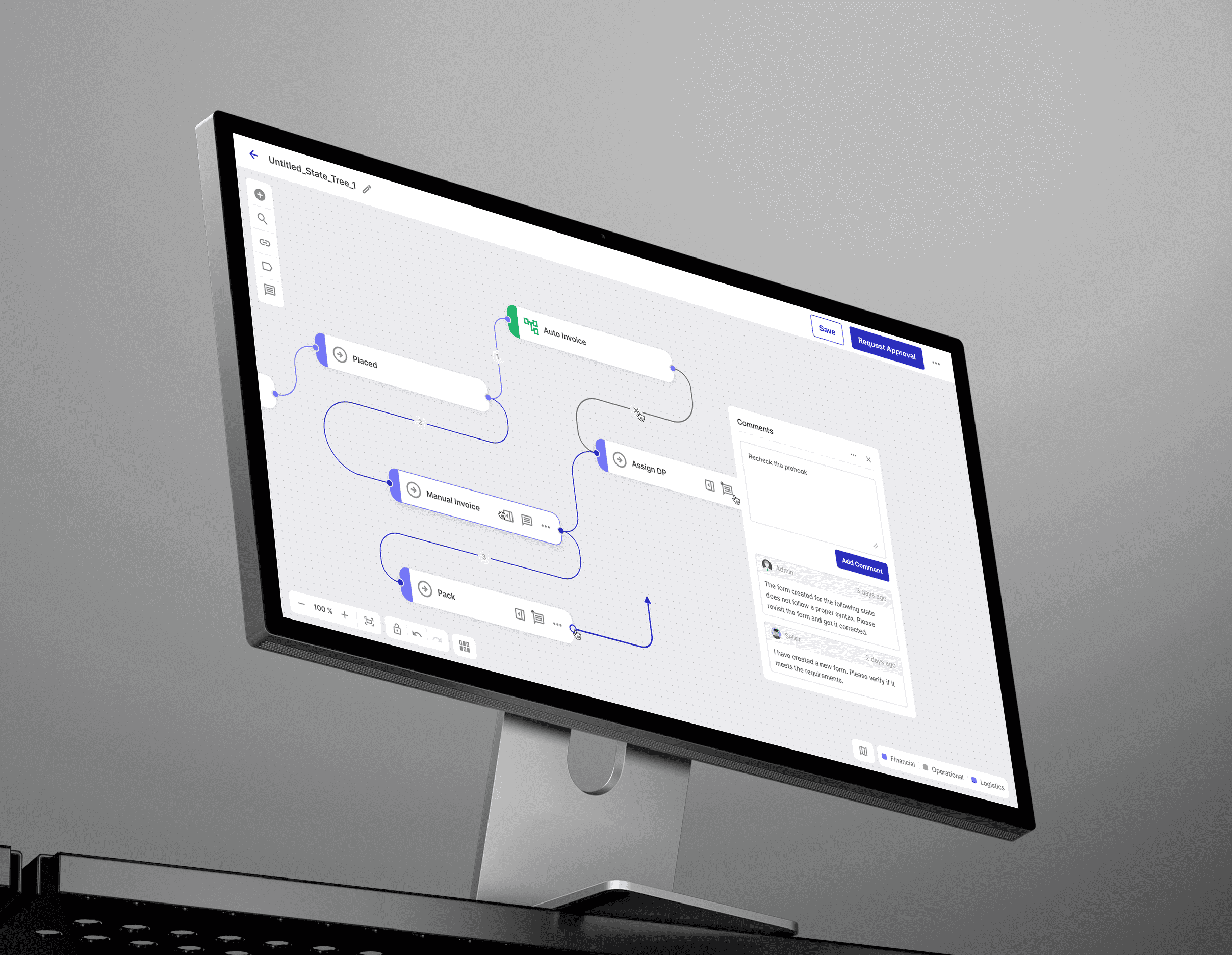 Visualising the "State Tree": I architected a drag-and-drop canvas where operations teams could map out exact fulfilment states (e.g., Placed → Manual Invoice → Pack), assigning strict admin approval loops to sensitive transitions.