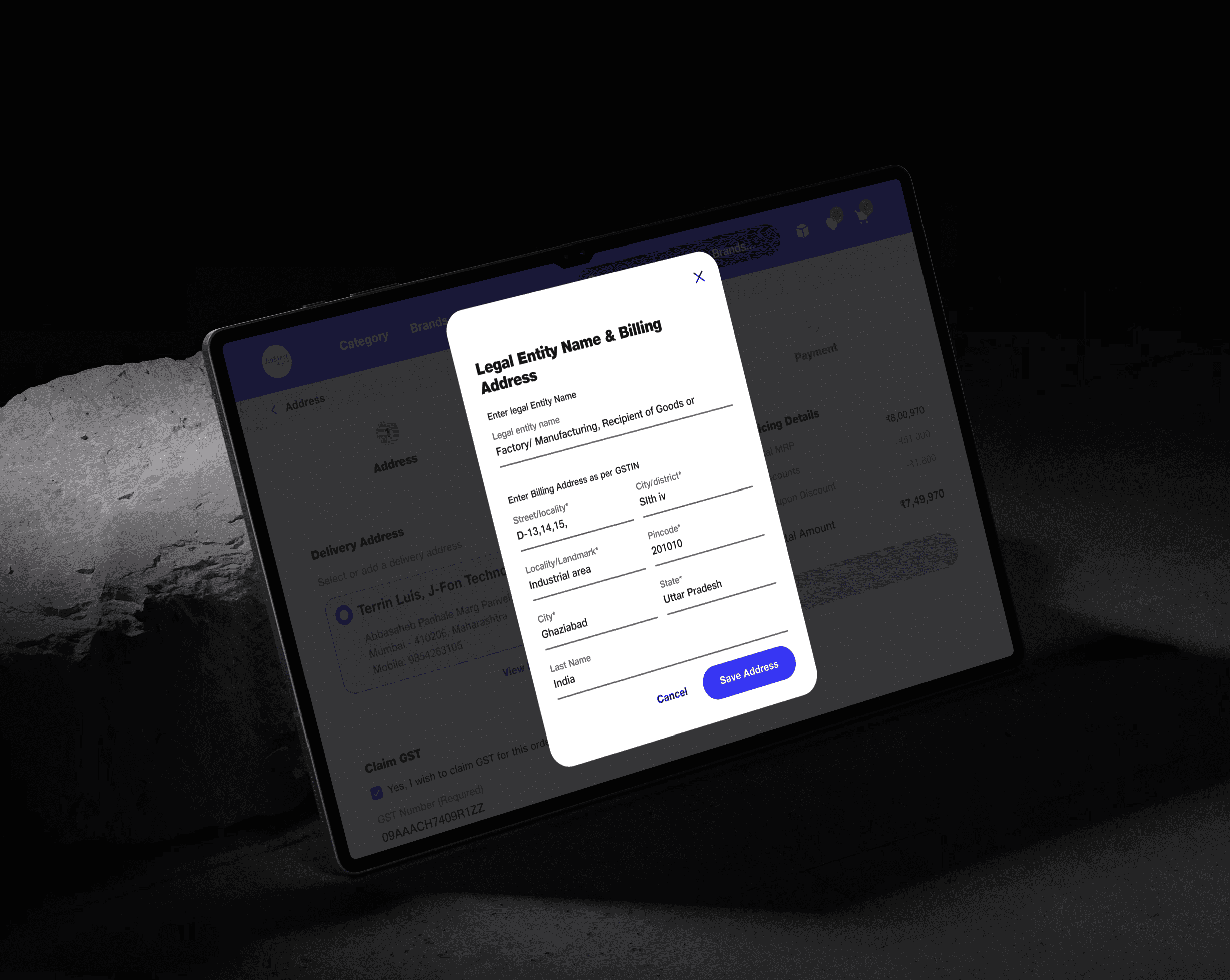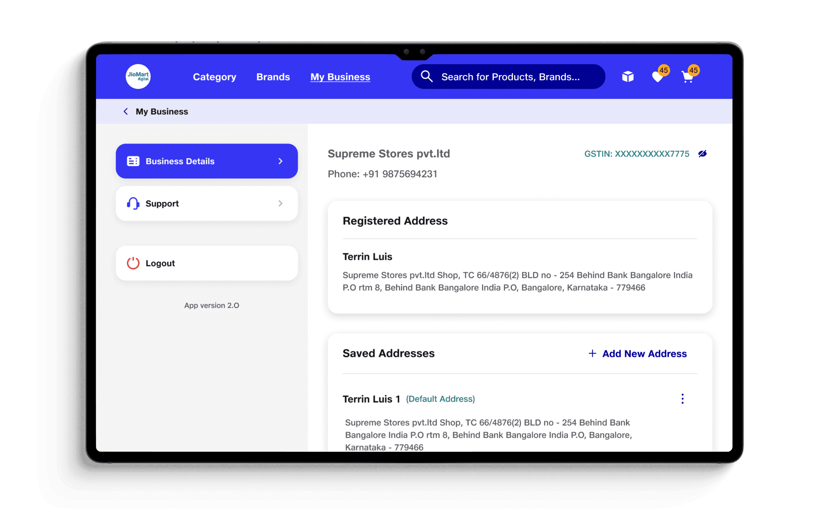 Tablet Master-Detail Architecture: I designed a dedicated split-pane architecture for tablets (the primary device used at store counters). This allowed retailers to seamlessly manage registered business details, copy GSTINs, and manage default addresses, drastically reducing downstream shipping and invoice failures.