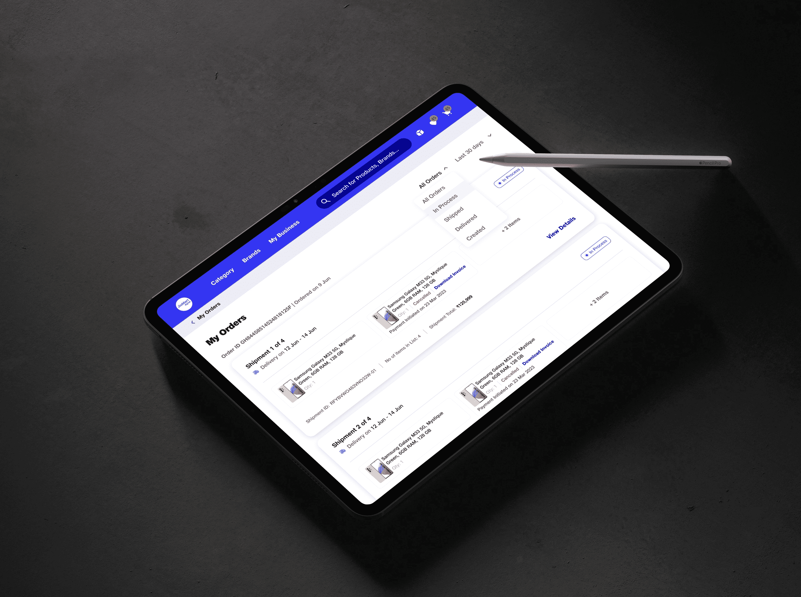 The Execution: Designed comprehensive status filters (Created / In Process / Shipped / Delivered) alongside immediate Invoice download visibility, drastically reducing the need for retailers to contact manual support.