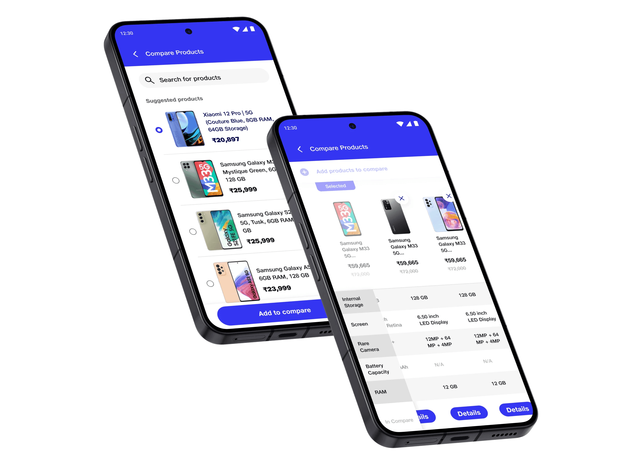 The Execution: I designed a robust, horizontally scrollable comparison matrix optimized for mobile. By utilizing a sticky attribute column (Storage, Camera, RAM), buyers can seamlessly scan complex specs across multiple devices without losing context.