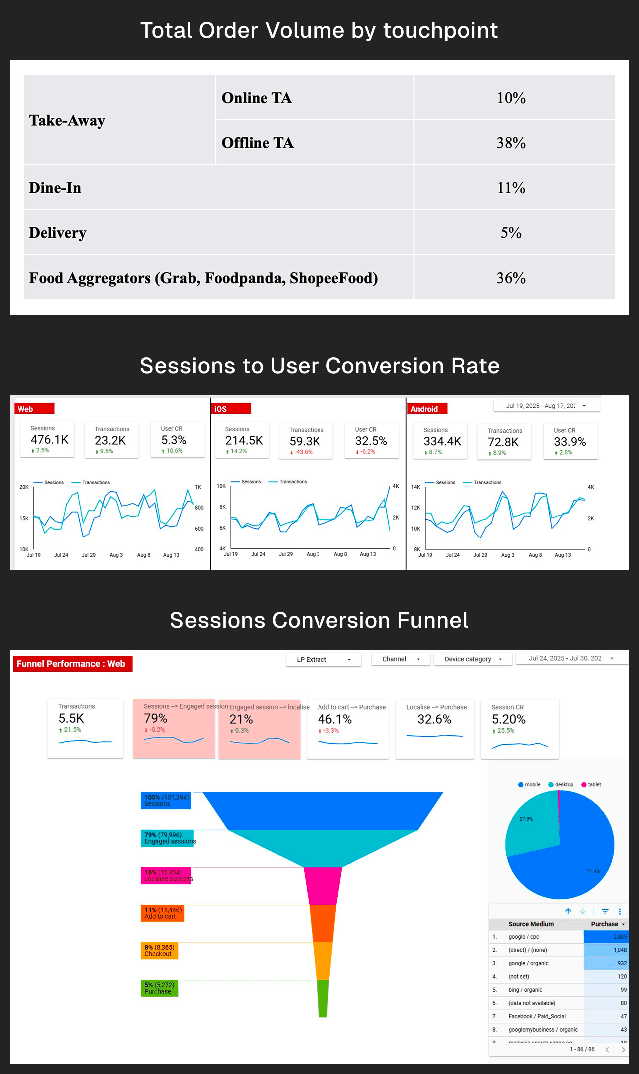 Funnel reality (where users drop): Web conversion lagged massively vs app: Web user CR ~5.3% vs iOS ~32.5% and Android ~33.9%. The single biggest leak was localisation on web: 101,294 sessions → 79% engaged → only 15% “localise success” → 11% add-to-cart → 8% checkout → 5% purchase. That means ~85% of users failed before we could even show accurate menu/pricing (the point where QSR ordering becomes “real”). Checkout also underperformed on web: 63% completion vs App ~80%.